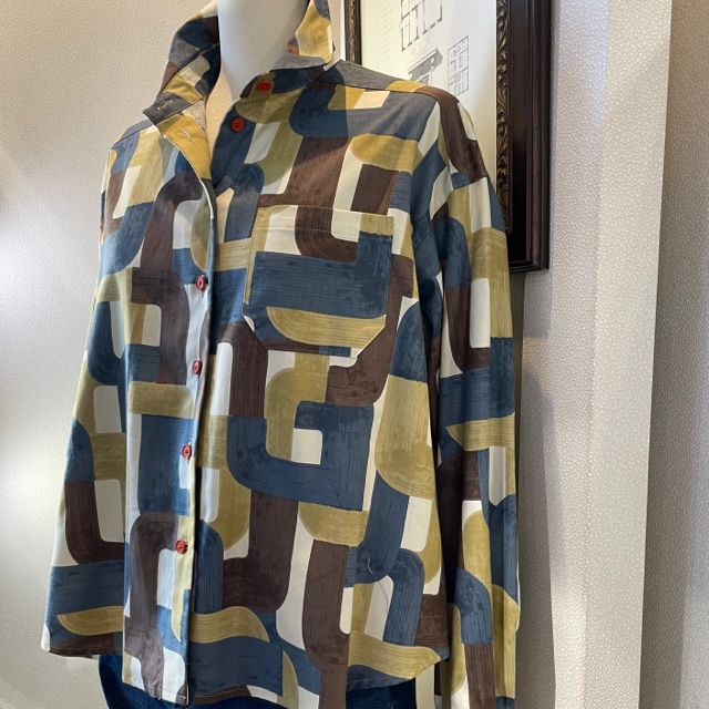 個性的なプリントパネルは、アンニュイな配色がとってもお洒落。オレンジ色のボタンがアクセント。後ろ丈が長めで、羽織りものとしても一枚ででも着映えします。綿100% サイズ:フリー 税込¥20,900(本体価格¥19,000) Hayama Time 日本製