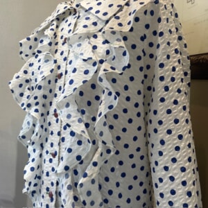 涼感のあるサッカー素材に水滴のようなドットプリントで、甘すぎない仕上がりになっています。配色を施したボタンホールなど、一着の中にたくさんの魅力がつまっている…そんなブラウスです。No.938215 Size.38 Col.112 Qua.綿100% 税込¥31,900 MADE IN JAPAN