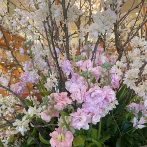 ホテルのロビー装花は、春爛漫な卯月にふさわしい、桜。そしてアセビ、ルスカスです。