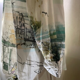 この美しい風景プリントはフランス製生地。今秋も華やかなプリントのブラウスが続々入荷しています。